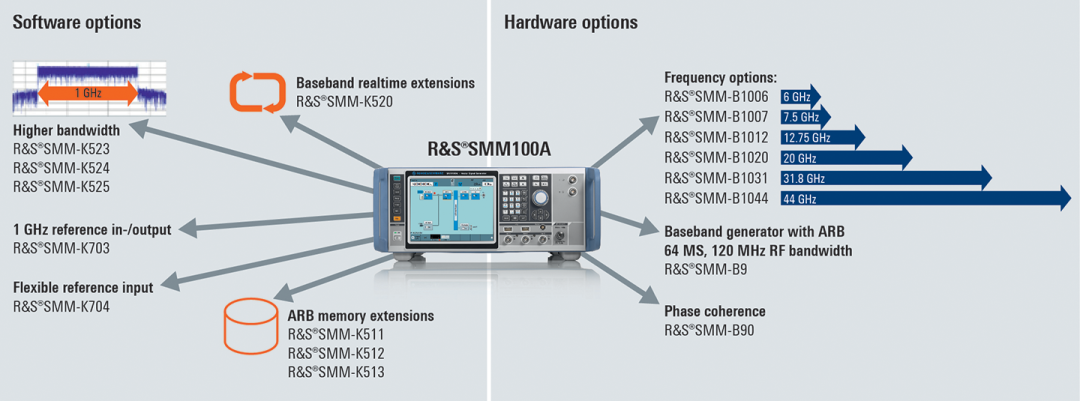 根據客戶從研發(fā)到生產對于射頻性能的廣泛需求,我們提出選件的概念來提高儀表的配置靈活性。R&S®SMM100A具有從6GHz到44GHz的六個最大頻率范圍選件和四個從120MHz到1GHz的調制帶寬選件來滿足所有主要設備的頻帶需求。用戶只需輸入一個密鑰代碼即可隨時根據需要,升級儀器的功能。